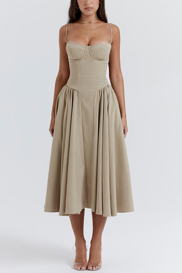 Solid Color Vintage Slim Fit Suspender Pocket Midi Dress